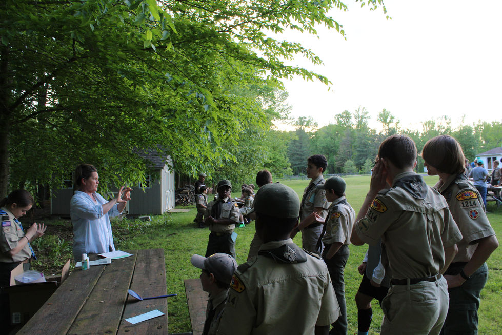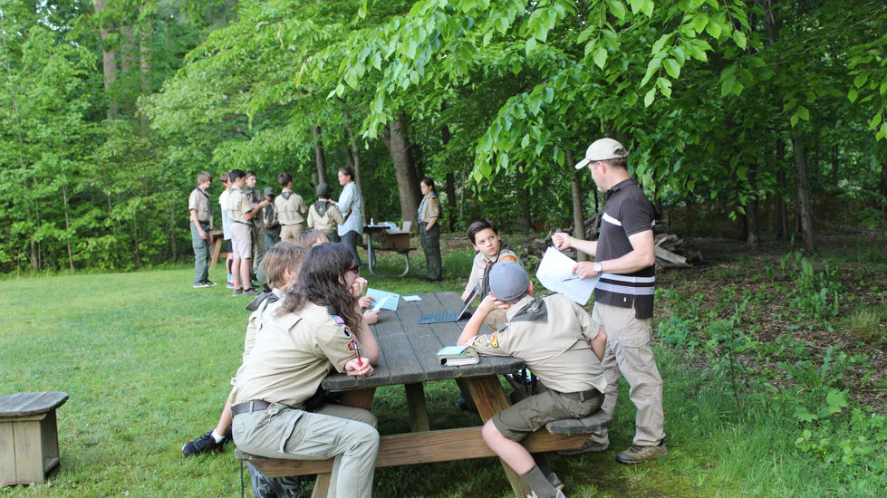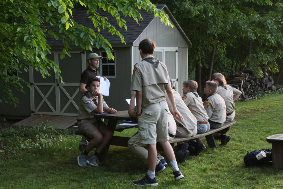 A collection of outdoor scouting activities, including preparing food, gathering around picnic tables, and interacting near a shed.